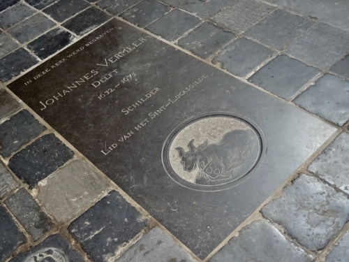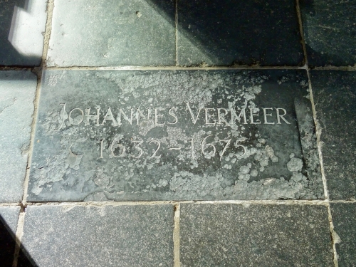 フェルメールは1632年に生まれ新教会で洗礼を受けましたが、彼が亡くなり埋葬されたのは、この旧教会です。しかし、フェルメールの墓石は無く、埋葬されてあったと推測される場所に、名前の入った小さな石が1975年に置かれました。そして2007年に、新たな記念碑の石が教会の床に置かれました。