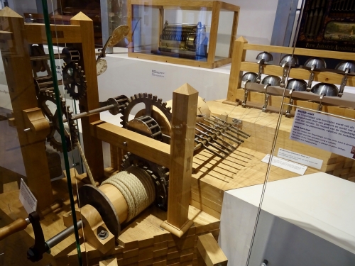 ヨーロッパの教会でもよく聴くことのあるカリヨン(鐘)が、博物館の中央部にも置かれてあり、ガイドさんがその仕組みを解説して実際にカリヨンを鳴らしてくれます。お土産で買う小さなオルゴールと同じ構造で、大きなドラムに付いているピンが鍵盤のようなレバーを弾き、結び付いているワイヤーを通してハンマーがベルを叩くという仕組みです!