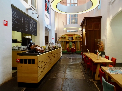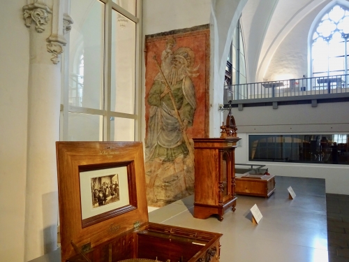 この博物館は「ブールケルク」(Buurkerk) という、中世に建てられたゴシック様式の教会跡地を改装して利用しており、建物を見るとかつての教会の姿が伝わってきます。壁の一部には、教会であった当時の壁画も、そのまま残されているのが見られます。屋根の作りは、まさにゴシック建築の教会の姿そのものです!