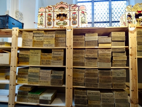 博物館の2階にも、たくさんのコレクションが並んでいて、過去に造られた自動演奏のピアノやオルガン、時計、オルゴール、そしてストリートオルガンの楽譜でもあるオルガンブックも多数保管されています。これらのコレクションをデモンストレーションで自動演奏することはありませんが、歴史的に貴重な作品が観られるという大変興味深いものがあります。