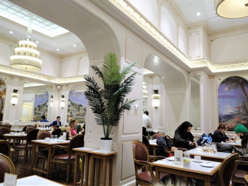 続いてカフェスペースのご紹介です。「ANGELINA PARIS(アンジェリーナ・パリ)NY店」には、シャンデリアがきらめくゴージャスなカフェが併設され、コーヒーや紅茶とともにスイーツをいただくことができます。
