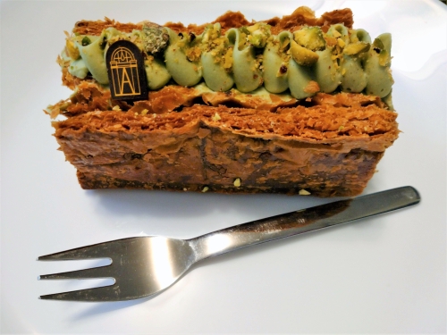 筆者は、「Millefeuille pistache(ピスタチオミルフィーユ/$10=約1,220円)」 とコーヒー($3.5=約427円)をオーダー。カリッとしたピスタチオクラッシュとさくさくパイの、ダブルの食感が楽しいミルフィーユは絶品! 香り高いピスタチオクリームとコーヒーの相性も、バツグンです。