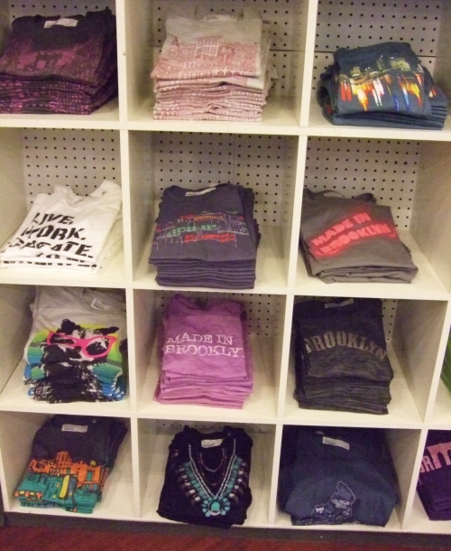 街中の電線に止まる鳥たち、工場地帯の水道タンク、ブルックリンのアパートメントの外観。店内には、ブルックリンやニューヨークをテーマにしたイラストが可愛らしいアート系デザインのTシャツが豊富に置かれています。