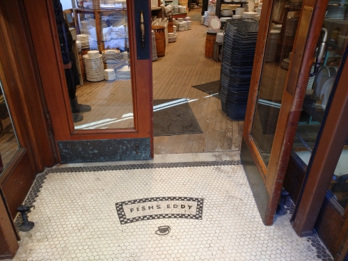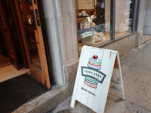 「フィッシュ・エディ (Fishs Eddy)」の店内は、お店に入る前からすでに可愛い! エントランス前の立て看板に描かれたカラフルなイラストや、足元のタイルに刻まれたロゴマークに、テンションが上がりまくりです。