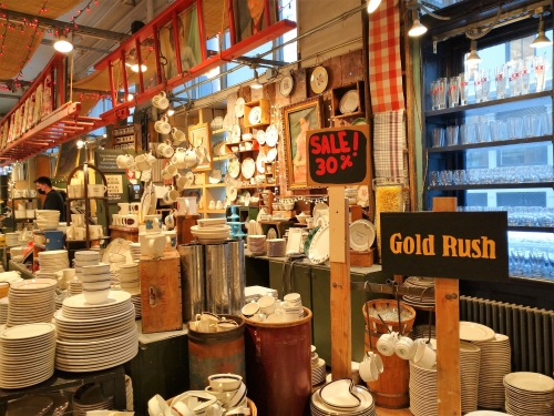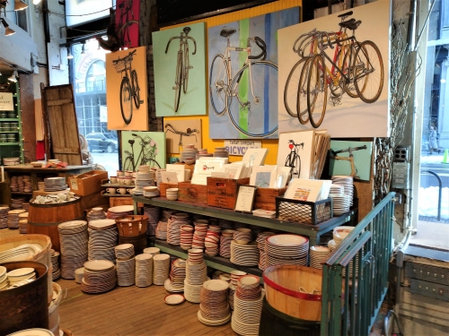 「フィッシュ・エディ (Fishs Eddy)」では、手書きのポップや商品ディスプレイにもぜひ注目してください。セール品コーナーにはGold Rushのポップが添えられ、まさに“掘り出しもの”を探し当てるようなユーモアたっぷりのムードが。また売り物なのかディスプレイなのか、店内には大きな絵がいくつも掲げられ、センス良い空間を創り上げています。