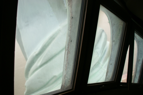 王冠までの最後のアクセスは、狭いらせん階段。自由の女神の内側のどの部分を歩いているのか想像しつつ、王冠部分の展望台に上って行きます。