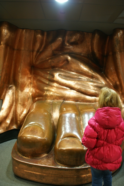 自由の女神像の台座部分までエレベータで昇り、初代のトーチが飾られたメインロビーへと向かいます。チェックインカウンターでリストバンドを見せて、階段を上がって行きます。