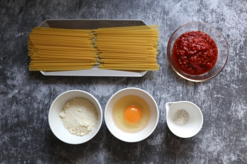 ①ボウルに卵を割り、パルメザンチーズを入れて混ぜたら、パスタソースと塩も加えてしっかり混ぜます。