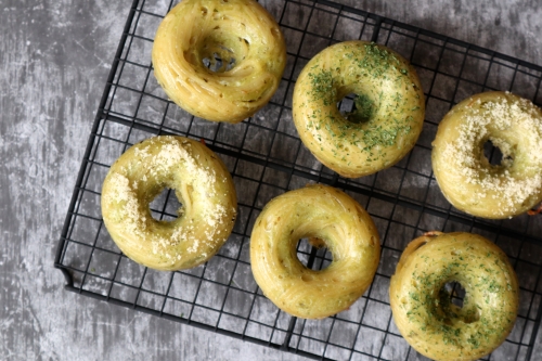 • 写真:bluemoonバジルソース(大さじ2.5)で作った「スパゲッティドーナツ」はうっすら綺麗な緑色に!