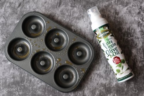 • 写真:bluemoonオリーブオイルスプレーをドーナツ型の焼き型に吹きかけた様子。Amazonで購入したオリーブオイルスプレーは1,104円(税込)