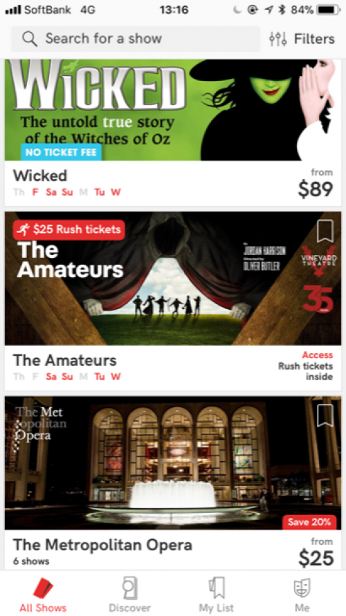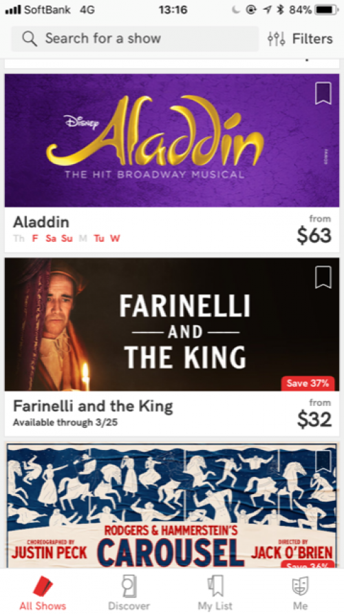 WICKEDは$89(約9,700円)から、CHICAGOも$50(約5,450円)からなど、人気ミュージカルもこのアプリから割安で購入できます。