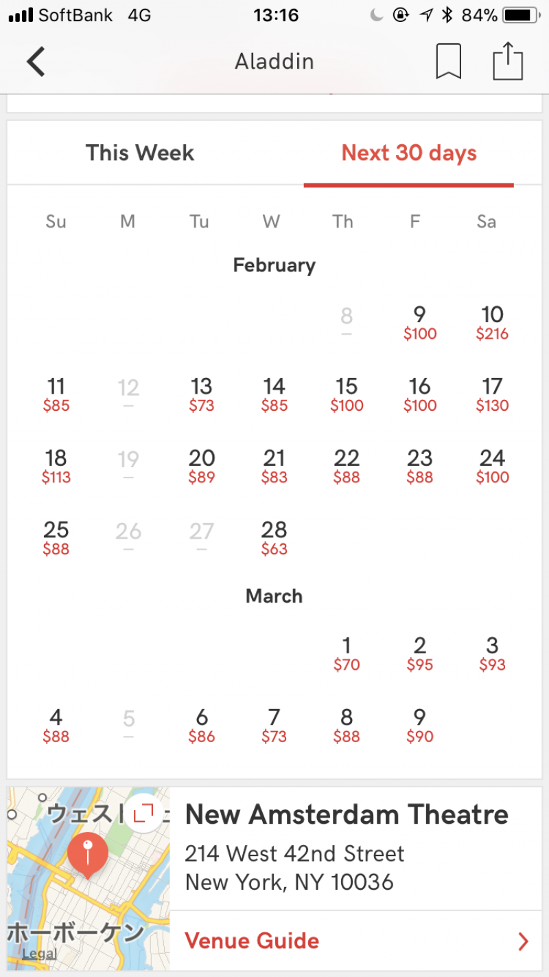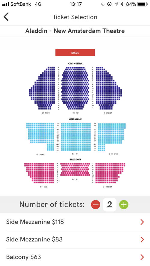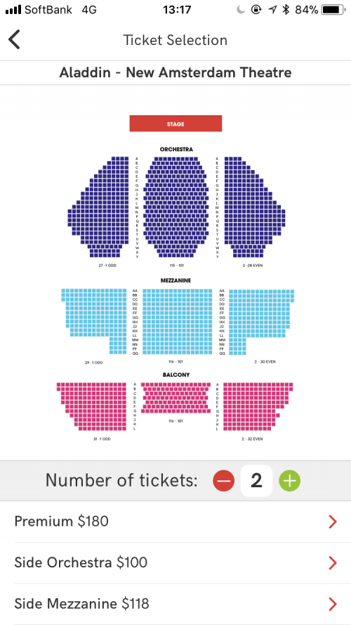 筆者は大ヒットミュージカルのAladdinを観ましたので、Aladdinの画面で操作します。