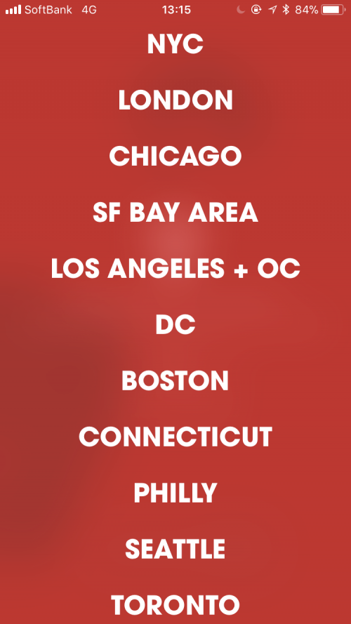 Today Tixのアプリは、この赤いアイコンです。インストールして開くと、エリアを選択する画面が出てきますので、まずはNYCをタップ。
