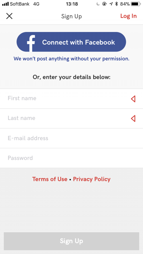 はじめに、名前とメールアドレスを入力します。Facebookのアカウントでも可です。