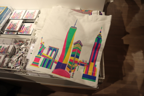 NYのカラフルなスカイラインのイラストがキュートな、キャンバス地のトートバッグやポーチはMoMA訪問の記念に自分用にも買いたいアイテムです。
