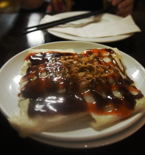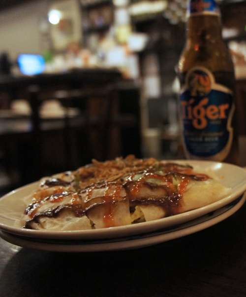 シンガポールビールのお供におすすめなのが、油で揚げずに蒸した春巻き料理“POH PIAH”($5.75)。野菜たっぷりでちょっとお好み焼きに近い感じですがスパイシーなので、お酒がすすむ一品。揚げた干し海老がアクセントになっていて、これまた海老好きにはたまらない一品です。