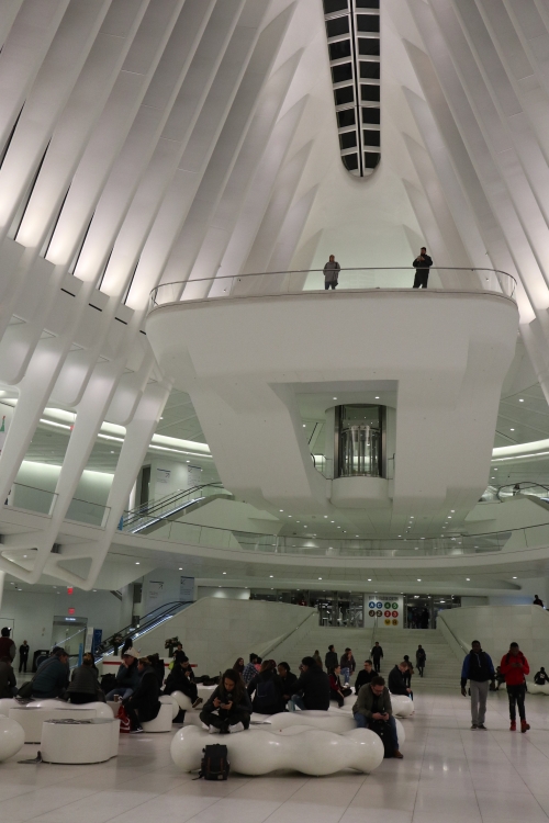 オキュラスの中へ入ると、外から見た印象よりもずっと大きくてビックリ!白くて神聖な雰囲気で、天井の窓からはワン・ワールド・トレードセンターの先端までが見えるように設計されています。