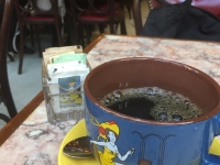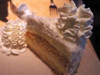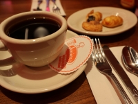 写真:bluemoon ホットコーヒー 3.5ドル(約385円)※ミニデニッシュが3つサービスで付いて、コーヒーはおかわり自由。 |  写真:bluemoon COCONUT LEMON LAYER CAKE 8.5ドル(約935円)とWhipped Cream 1.25ドル(約137円)で 9.25ドル(約1,107円) |  写真:bluemoon オリジナルチーズケーキ 8.25ドル(約907円) |