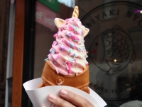 写真:bluemoon “なんてこった?!”ホットファッジサンデー 12.95ドル(約1,424円) |  写真:bluemoon 人気のUNICORN TAIYAKI 8ドル(約880円) |  写真:bluemoon 「TAIYAKI NYC」の店内壁には、今までに掲載された雑誌やニュースの記事がいっぱい飾られています! |