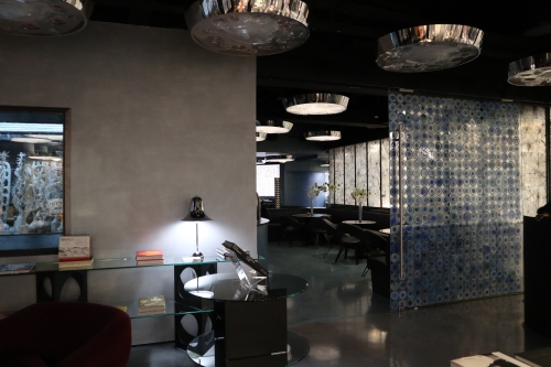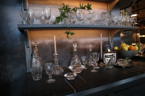 インテリアショップからそのまま入れる、フレンチが楽しめる「ラ・メルスリー・カフェ(La Mercerie)」はショッピング途中の休憩にもぴったり。自然光がふんだんに入る空間、ブルーのシルク・ベルベットのソファーがとても上品で、居心地が良さそうなカフェです。ショップで売られている食器が使われています。
