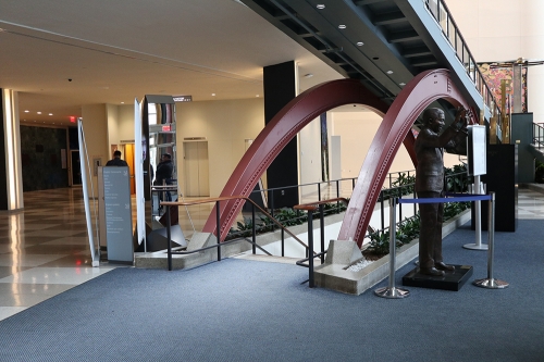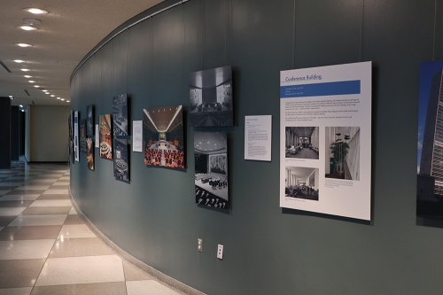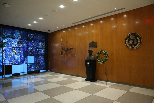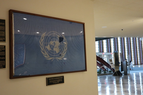 1Fのビジターロビーでは数々の無料の展示がされており、加盟国から贈られた芸術作品などを目にすることができます。先述した予約制ガイドツアーの受付場所もここにあります。