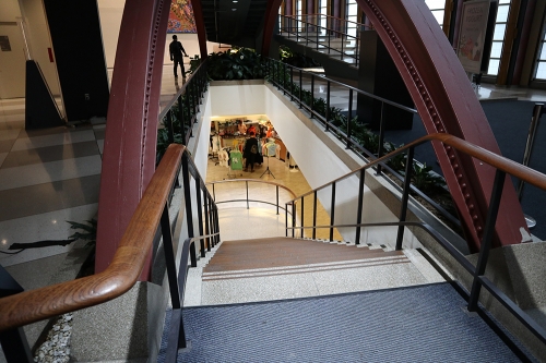 セキュリティーチェックを受けたら、広場を抜けてビジターセンター内部へ入って行きます。入り口から右のほうに、地下フロアへ降りる階段があります。