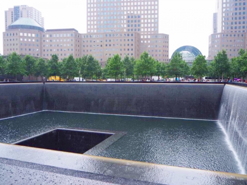 かつてのワールドトレードセンターがあった場所に現在はノースプールとサウスプールと呼ばれる慰霊碑があり、9.11で被害に遭われた方の名前が彫られています。こちらもミュージアムとともに訪れてみてください。「プール」と名前がつけられていますが、滝のようになっていますよ。