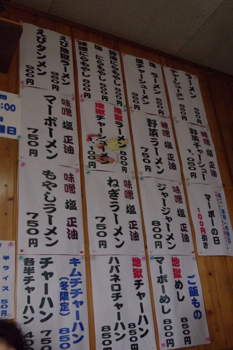テーブルやカウンターにメニュー表はなく、すべて壁に張り出されています。お店の名前からは拍子抜けするような、普通のメニューがいっぱいです。塩、しょうゆ、マーボーなどなど、豊富なメニューのラインナップです。