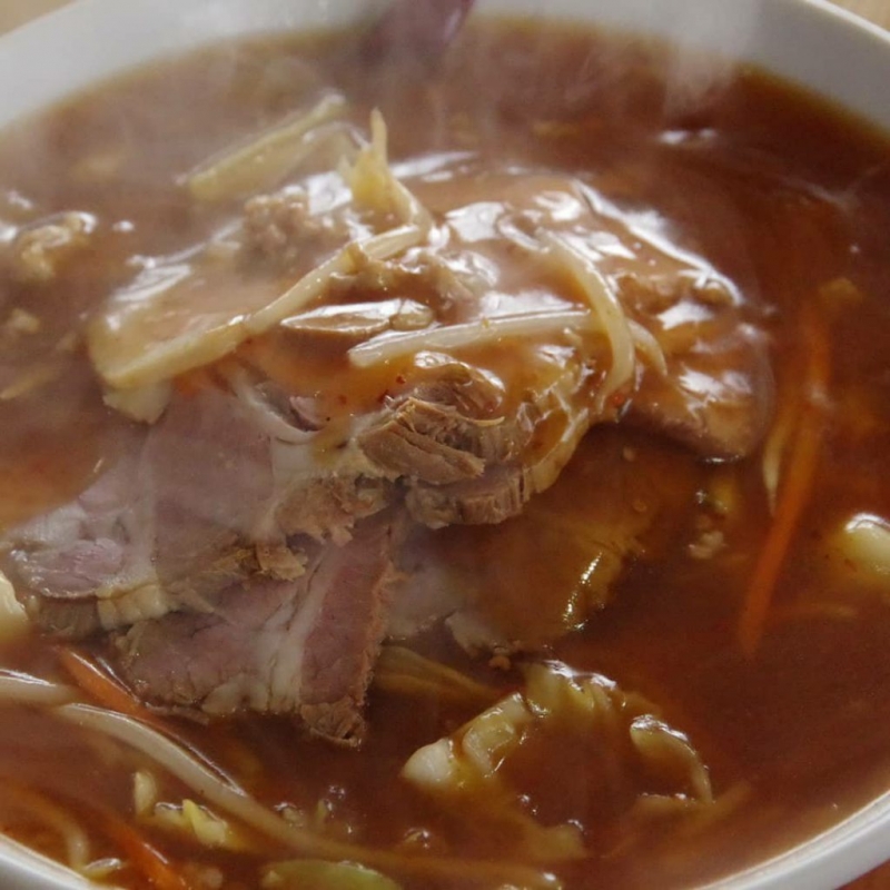 またラーメンの上には野菜もたっぷり。キャベツ、モヤシ、ニンジンを熱々のあんかけにして、ラーメンの上にとろ〜りと乗せてくれます。