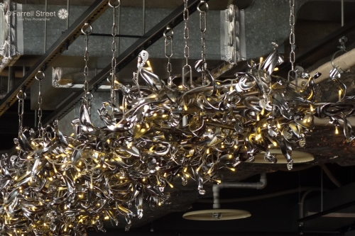 店内はコンクリートと黒を基調としたシックな空間で、メインフロアの中央には長さ8mのロングテーブルが存在感を放っています。目を引くシャンデリアは、世界で評価されているネイルニッパーの専門店SUWADAが製作したアートシャンデリアとなっていて、空間からもそのこだわりが感じられます。