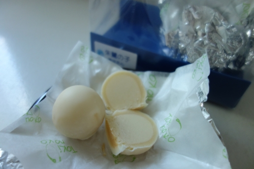 コロンとほおばると、くちどけの良いホワイトチョコが溶け、絶妙な甘さに。他にも、キャラメルソース味や、ラズベリー味、秋には、黄身餡の中に栗の粒入りでマロンチョコレートがけなど、季節に応じて楽しめます。