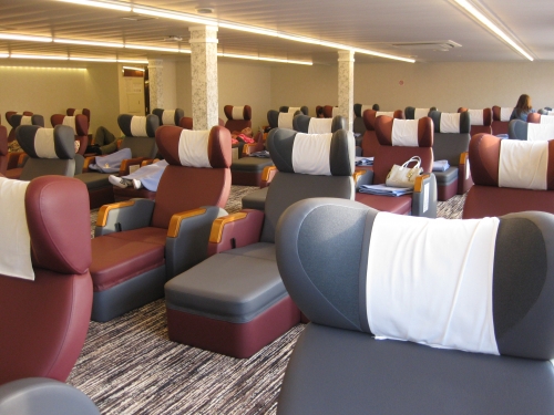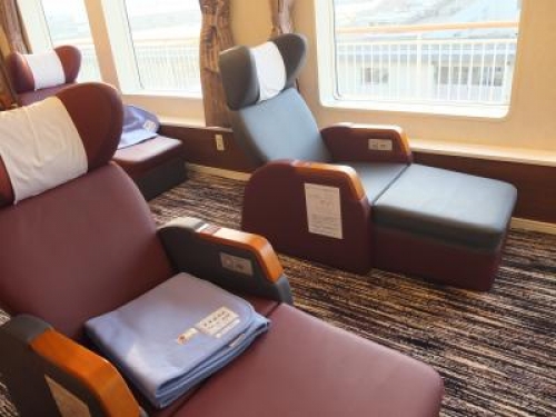 大人数を収容できるカーフェリーでも、混雑時は通路や階段まで、人で溢れかえっています。混雑が予想される場合は、早めに1等の指定席を予約するのも一つの方法です。少しの差額で、ゆったり過ごせるので快適です。180度リクライニング式、スピーカー内臓のチェアで、毛布も無料貸し出しです。