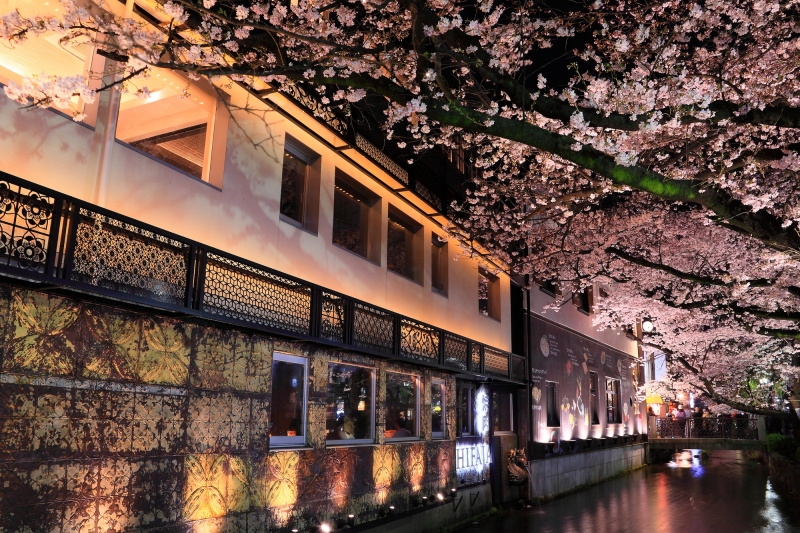 このエリアでは、高瀬川の桜と現代的な街のコラボレーションをカジュアルに楽しみましょう。高瀬川の西沿いには、多くの飲食店が並んでいます。窓から店内が覗けるようならば、逆に言えばその店の窓際は絶好の花見スポットのはずです。