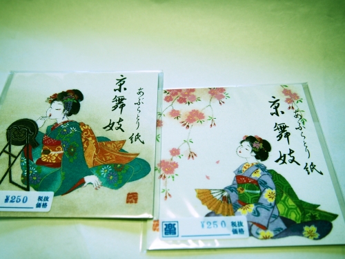 和紙と小物のお店です。葉書や便箋など紙製品好きはため息がこぼれてしまいそうなほどの品ぞろえ。『源氏物語』の場面をすべてそろえたポストカードシリーズは圧巻です。写真はあぶら取り紙です。裏返すとかわいい和紙のシールで留めてあるという凝りよう!