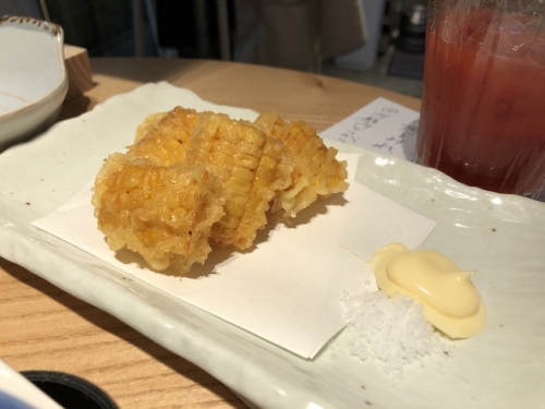 「とうもろこしの天ぷら」は近年よく見るおそうざいですが、文句なしの一品でした。マヨネーズと塩でいただきます。「タコとニンニクの芽炒め」はちょっとしたイタリアンのような内容で、気分転換によいです。「箸休めのガリ」は、突き出しとして無料で提供され、おかわり自由です。