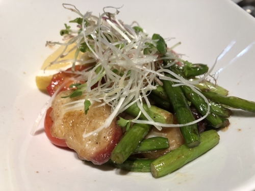 前菜でありながら、メインとも言えるメニューです。本日のおばんざいが、おまかせ(※)で3種類盛られています。右から順番に、揚げたサーモンのマリネ、葉菜類の白和え、 唐辛子と糸蒟蒻の煮浸しです。どれも味がハッキリしていて(濃いという意味ではなく、美味しい部分が強調されているような加減となっている)、飽きません。唐辛子と糸蒟蒻の煮浸しはジャコの食感が徹底的にパリパリで、印象的でした。