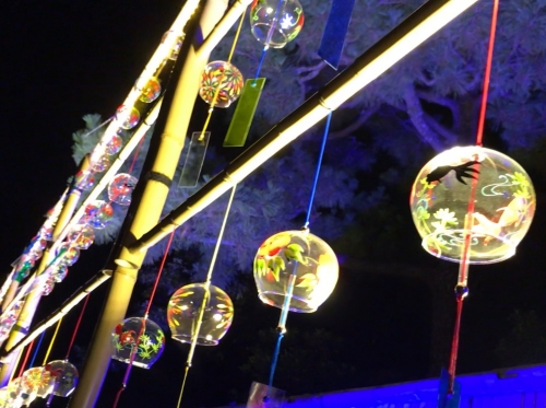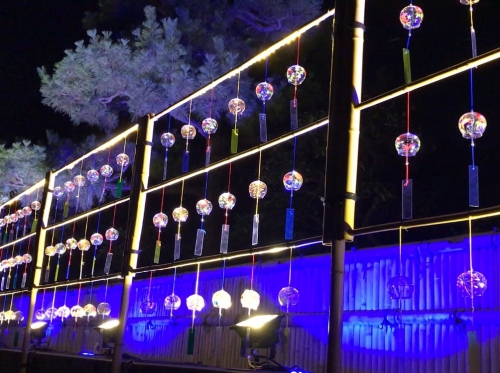 ライトアップされた風鈴が並びます。風が吹くたびに涼しげな音色が響きます。
