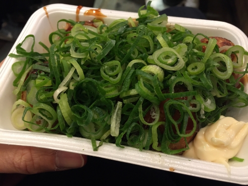 ジャンボたこ焼き6個で200円という価格が嬉しいですよね。写真は「ねぎぶっかけ(260円)」です。その他、「抹茶塩たこ焼き(350円)」など、京都らしい変わったメニューもあります。ぜひトライしてみてください。