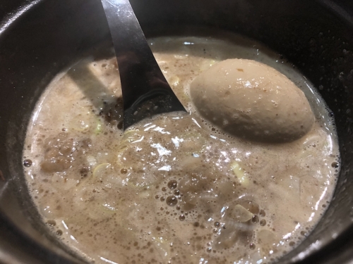 魚介系のスープにモツと麺を絡めて食べるので、圧倒的に印象に残る食べ応えでした。スープのお椀が「ストウブ/Staub」の鍋というのもオシャレです。