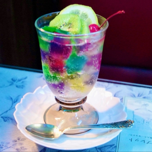 そんな喫茶ソワレの看板メニューは、なんと言ってもレトロでインスタ映え抜群の「ゼリーポンチ」!ほのかな甘みのある、どこか懐かしい味のソーダの中に、イエローやグリーン、パープルなど、色とりどりのキューブ型ゼリーが浮かびます。店内の青白いライトに照らされてキラキラと輝く様子は、まるで宝石のような美しさです。