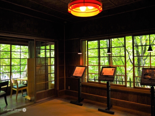 館内では、奥日光の国際避暑地としての歴史や英国文化についての展示などから、彼が日光をこよなく愛したことが伺われます。2階の広縁からは、絵にかいたような中禅寺湖の美しい景色が広がります。