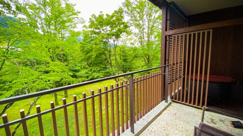 露天風呂のあるバルコニーには、チェアーとテーブルも。緑豊かな森林を眺めながら、コーヒーを飲んだり、読書をしてみたりするには最適です。屋根もついているので、小雨の日であれば問題なく使用ができます。露天風呂があるので当然ですが、目の前には建物や道路は一切無いため、日常から離れたかのような時間を過ごせます。