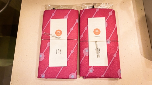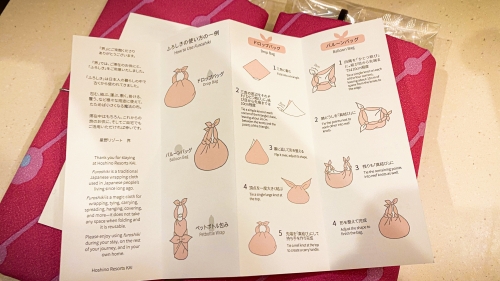 また水回りのアメニティは、風呂敷の中に包まれています。実はこのおもてなしは星野リゾートならでは。玉が連なったオリジナルのデザインになっており、宿泊客と界との縁がつながるようにとの願いが込められているそうです。もちろんこの風呂敷はお持ち帰り可能!包み方の説明書もついていますが、素敵なデザインの風呂敷は飾り物としても良さそうです。
