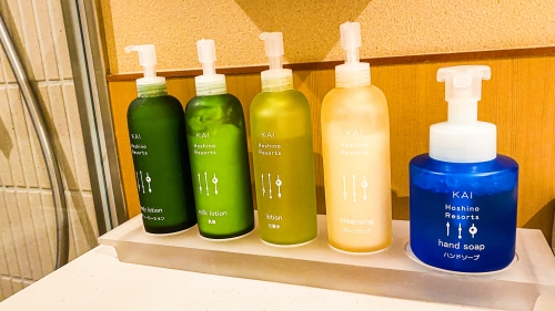 アメニティも星野リゾートならではのこだわりがあり、こちらは和漢生薬成分(紫蘇、芍薬、椿、茶実、雪ノ下など)を用いた身体優しいものなのだそう。温泉効果とあいまって、心身ともに健康になれそうです。