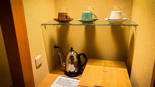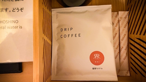 お部屋にはコーヒーやお茶など、基本的なアメニティが揃っています。カップはもちろん益子焼で、こちらは鬼怒川ならでは。またドリップコーヒーも星野リゾートオリジナルでした。こういうオリジナルのアメニティって、ちょっと特別感があって嬉しくなりますよね。