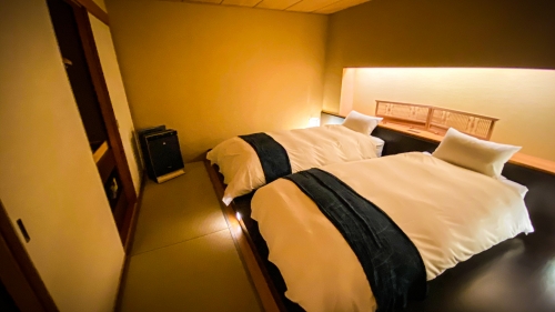 客室は居間とベッドルームに分かれており、2名の旅行ならゆったり広々使うことができます。星野リゾートでは特にベッドにこだわっており、こちらのベッドはふわくもスリープと呼ばれている、星野リゾートオリジナルのベッド。固すぎず柔らかすぎずでとても寝心地が良く、本当に雲に包まれているかのような気持ちになれるベッドでした。