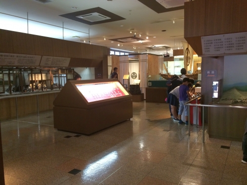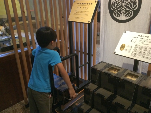 坑道を出たところにある資料館では、土肥金山の歴史に関わる人やモノ、金を使った昔の貨幣のことなどが解説されています。時代劇でみかける「千両箱」の重さも体験。これを持ちあげて走ったり屋根の上へ登ったりするのは、かなり大変そう?