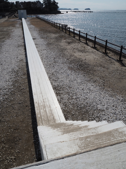 島の東地区にある東屋「イーストハウス」。対岸に見える「おひるねハウス」とは対照的な白い箱(東屋)は、海と空の青さにとても良く映えます。2つの白い箱を繋ぐのは60mのベンチ。階段を登って箱の上にも上がれます。