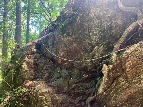 岩には鎖が設けられているので、その鎖と張りめぐらされた木の根を頼りに登っていくと、頂上には祠と2体の像が設置されており、厳かな雰囲気が漂います。