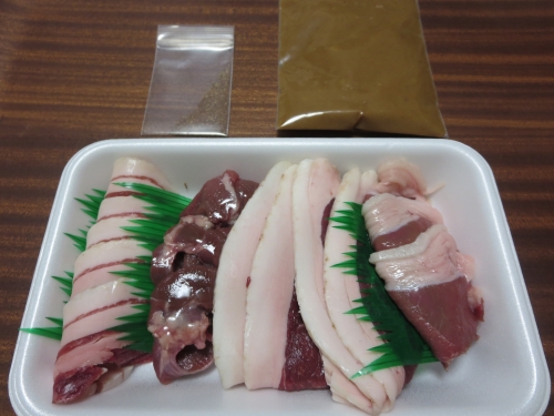 竹皮に包まれ、独特な盛り付け方で登場する1人分200gの猪肉は他店の切りかたよりも厚みがあり、バラ・脚・前脚・このしろなどがギッシリ!次の写真は4人分で800gです。